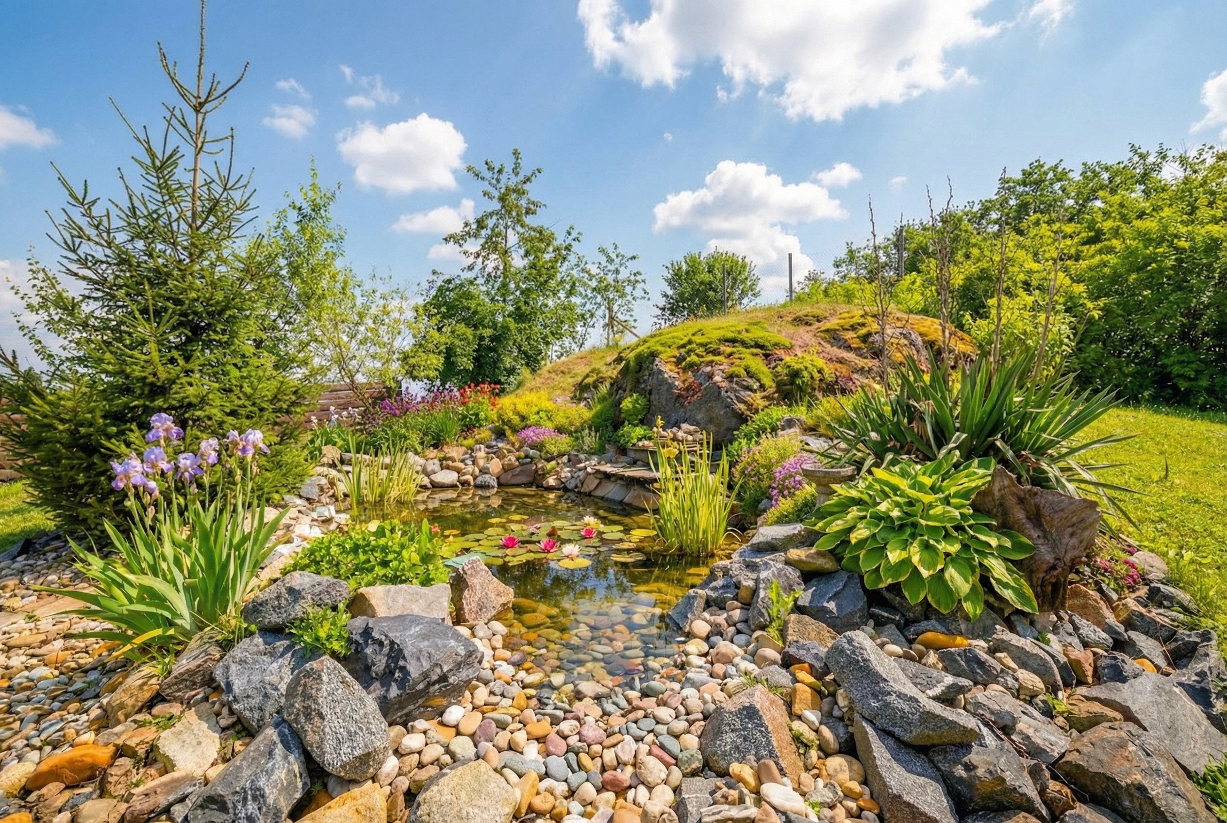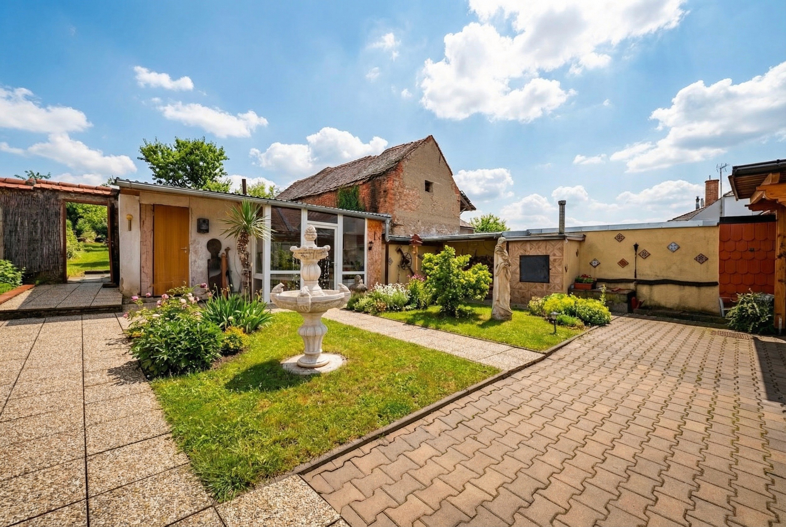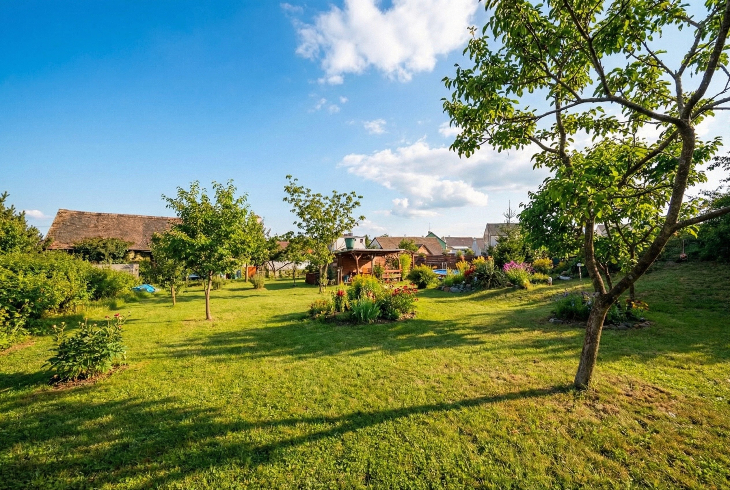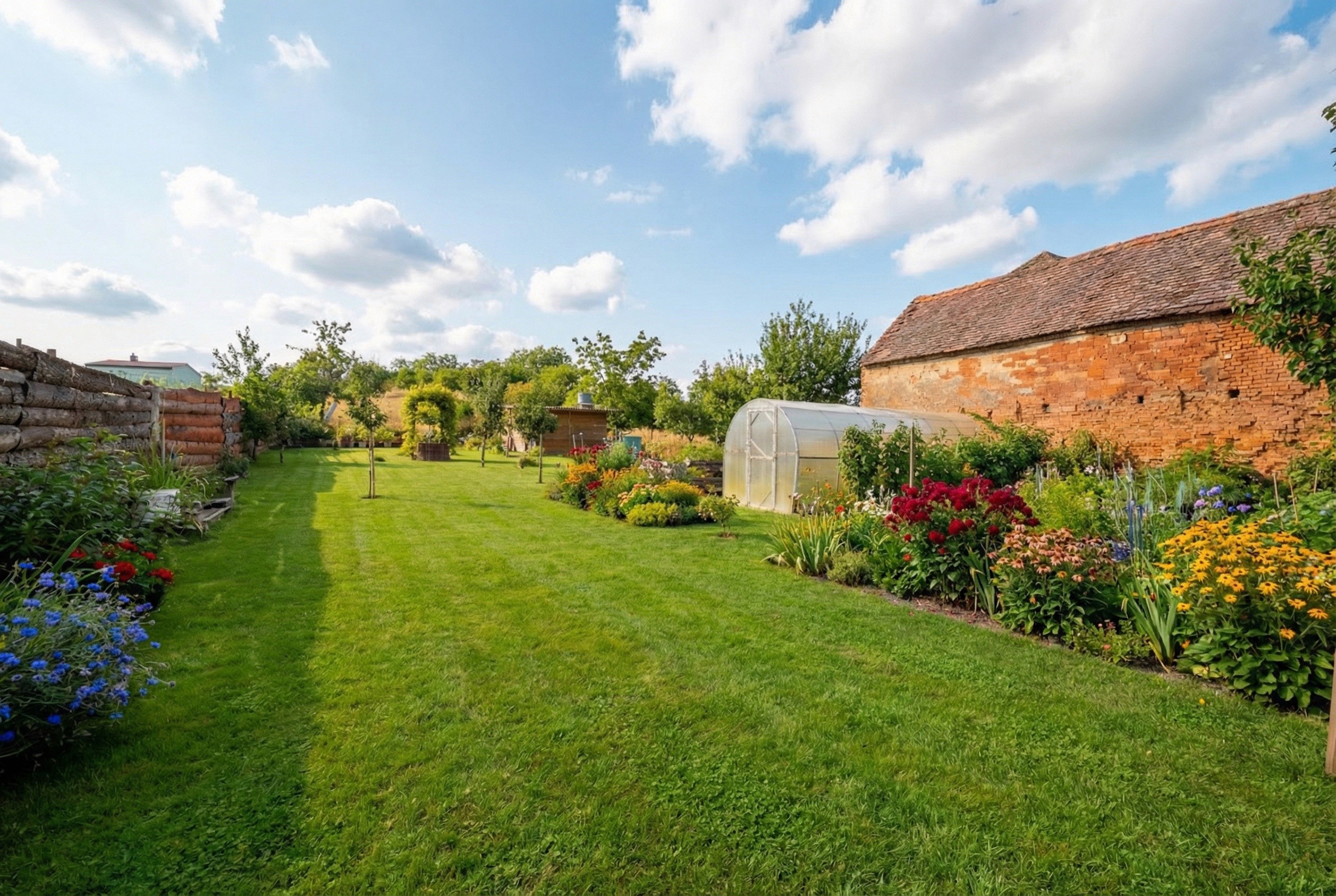 Zahrada: Okrasné jezírko, skleník, vzrostlé ovocné stromy a travnaté plochy