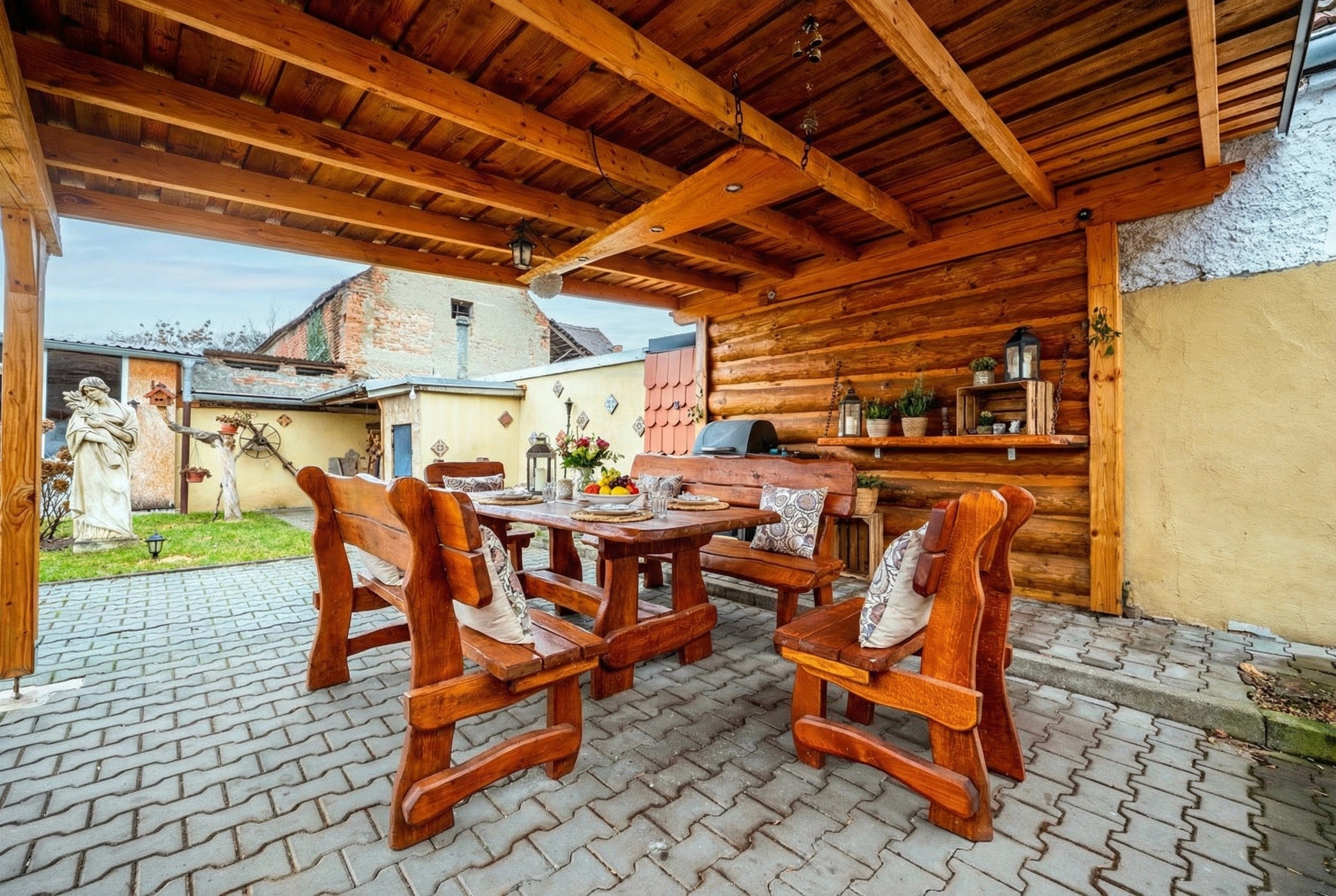 Posezení: Zastřešená dřevěná pergola pro venkovní stolování