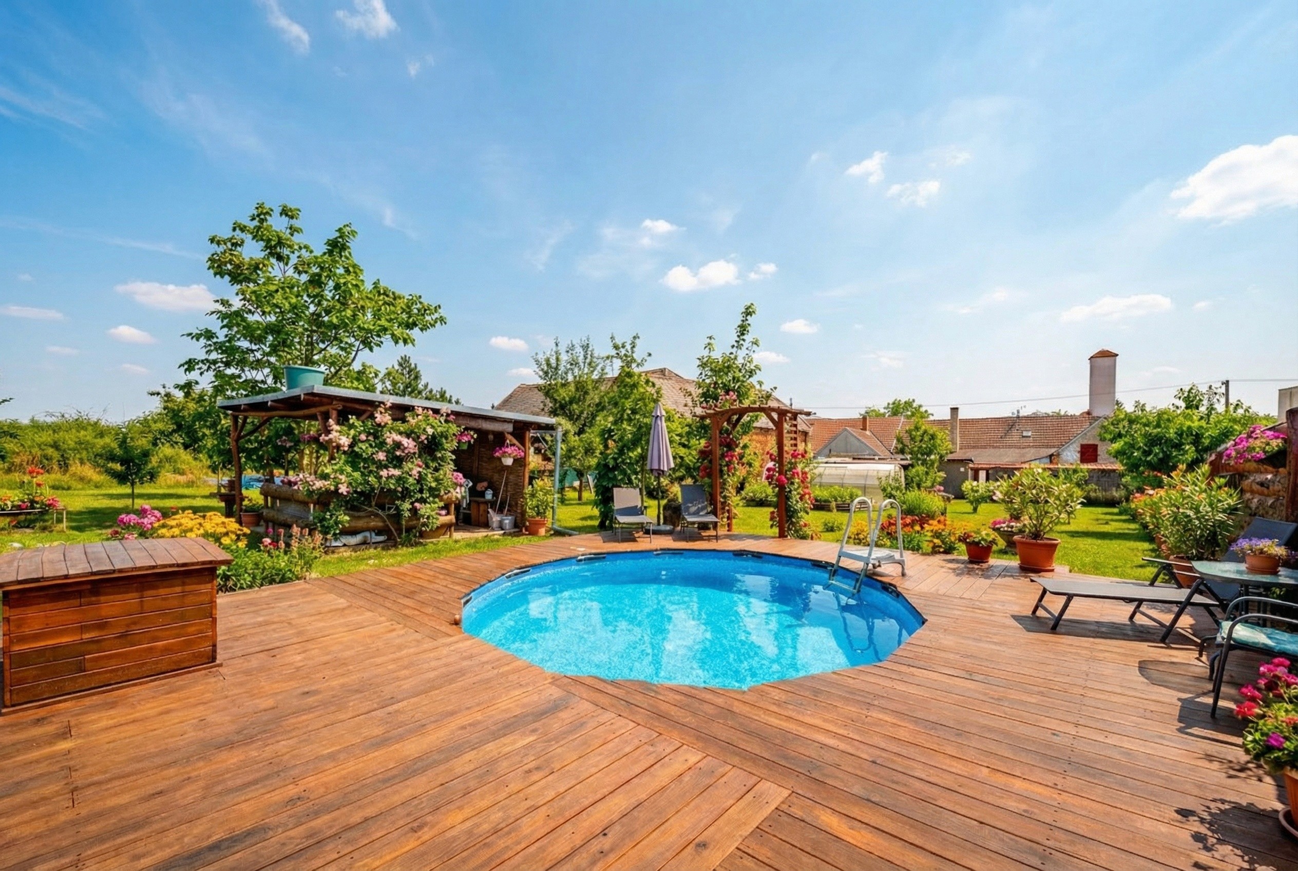 Bazén: Nadzemní bazén s dřevěnou opalovací terasou